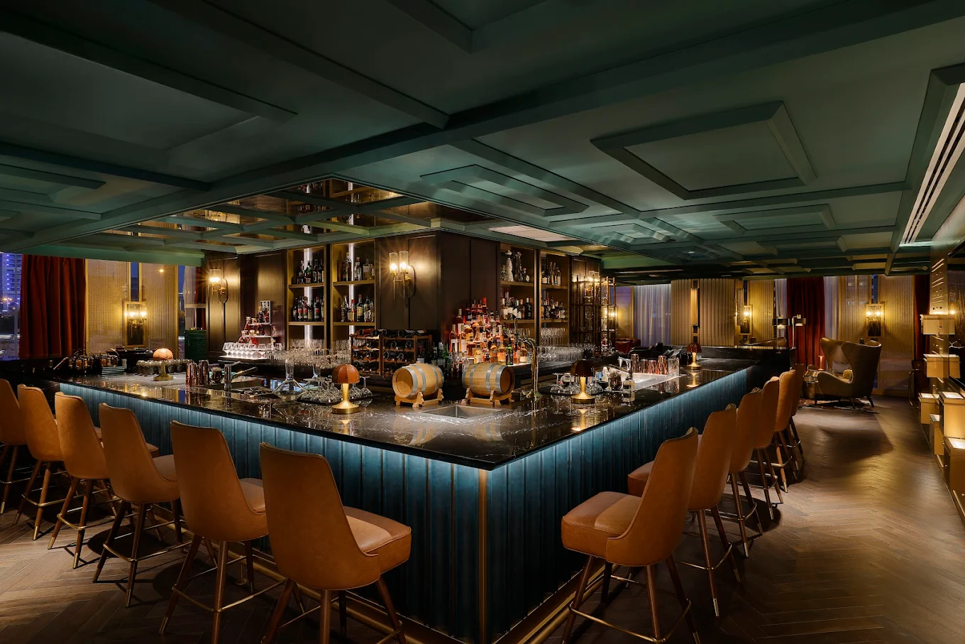 Large windows frame breathtaking views of Manama’s dynamic skyline, offering guests a front-row seat to the city’s vibrant energy as they sip their carefully crafted cocktails.